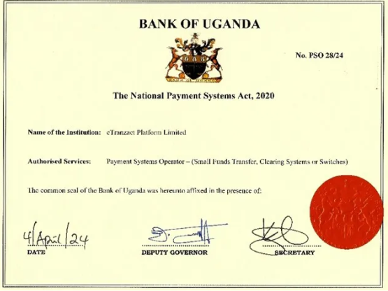eTranzact Platform Limited is registered in Uganda (No 80020001661618), authorized and approved as a Payment service operator (electronic funds transfer, clearing systems and switches), license No. PSO 28/24, and payment service provider (electronic money issuer), license No. PSP 21/24, by the Bank of Uganda, under the National Payment Systems Act 2020.